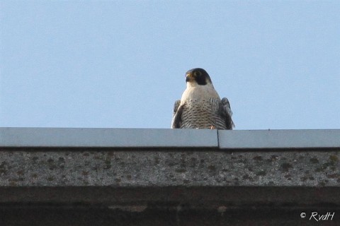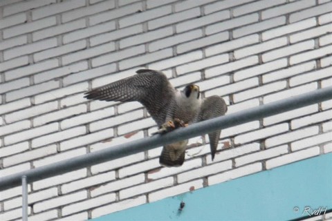 Rob was vanmiddag eigenlijk van plan om naar Bergerden te rijden. Omdat hij een boodschapje in de buurt van Presikhaaf moest doen (toevallig hè?), is hij eerst even bij Leo en Lotte gaan kijken. Toen hij het gebouw afzocht was er geen valk te vinden. Toch maar even afgewacht. Gelukkig maar, want daar kwam ineens een valk aanvliegen. Tegelijk kwam er nog een valk aanvliegen. Dat is mooi, allebei de valken thuis. Uhh, niet dus. Vanuit het niets kwam er een valk van het gebouw gestormd. Er was dus weer een derde valk! Gedecideerd werd nummer drie door Leo en Lotte verjaagd. Zo, klus geklaard. Zegevierend vloog het stel een paar rondjes rond het gebouw. Lotte nam plotseling weer plaats op het puntje van de antenne. De overwinning moest gevierd worden met een paring. Ha, ha, dat is ook een manier. Voor de rest werd er een beetje gezeten en gevlogen. Nummer drie is gelukkig niet meer terug gekomen.