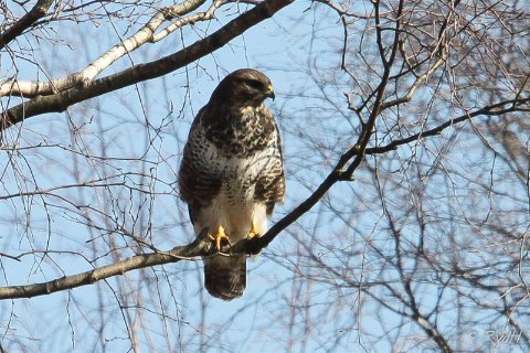 Geen herten vandaag. Ach, het kan niet altijd feest zijn. Ook zonder herten is het een genot om door het park te rijden. Toen we op weg naar de uitgang reden, kwamen we deze buizerd nog tegen.