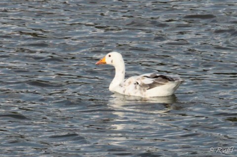 Ook zagen we deze witte gans rond dobberen. Even dachten we dat het een sneeuwgans was maar de zwarte uiteinden van de vleugels ontbraken. Het is dus gewoon een parkgans.