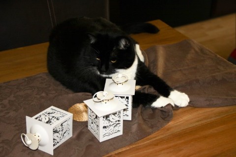 Tja, het personeel kan wel spulletjes op een bepaalde manier neerzetten, maar als katje zijnde geef je daar toch je eigen draai aan. Als je toevallig net op dat plekje wil liggen, dan duw je gewoon alles wat in de weg ligt opzij. Zo simpel is dat.