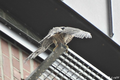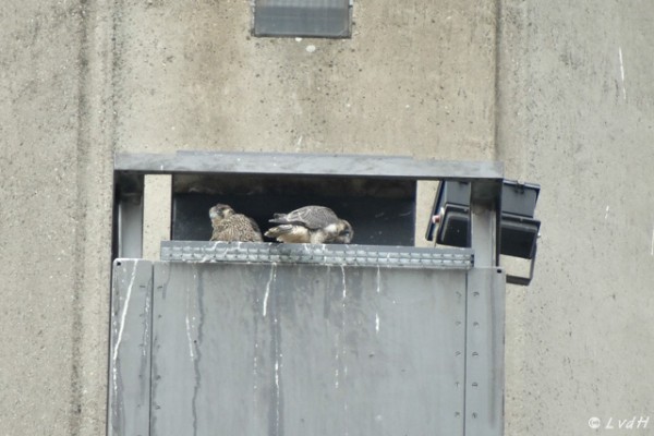 Vandaag moesten we weer in de buurt van Eindhoven zijn en hadden nog even tijd om bij de slechtvalken te kijken. Twee jongen lieten zich deze keer op het rooster van de kast zien.