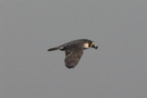 Met een vrolijk zonnetje zijn wij vanmiddag naar de toren gereden. Toen wij een tijdje hadden staan kijken zag ik een valk aan komen vliegen. De valk vloog rechtstreeks naar de nestkast en landde op het rooster. Gezien de grootte van de valk waren wij ervan overtuigd dat dit een vrouwtje was. Ze bleef een tijdje luidkeels gakkend op het rooster zitten. Er werd niet op gereageerd. Mevrouw besloot de nestkast in te gaan. Daar is ze een hele tijd gebleven.