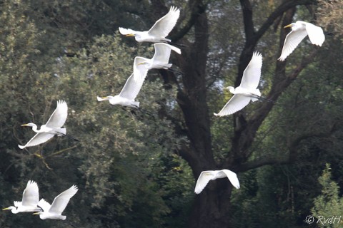 Helaas ging hij weer ver weg zitten. Nou ja, we hebben hem gezien en voor een stern is het een flink bakbeest. Vooral zijn grote oranje snavel valt goed op. Toen we verder reden kwamen we een leuke verrassing tegen. Bij een poeltje wat achteraf zag het helemaal wit. Er bleek een groep van ruim 50 Grote Zilverreigers te zitten. Wat een mooi gezicht!